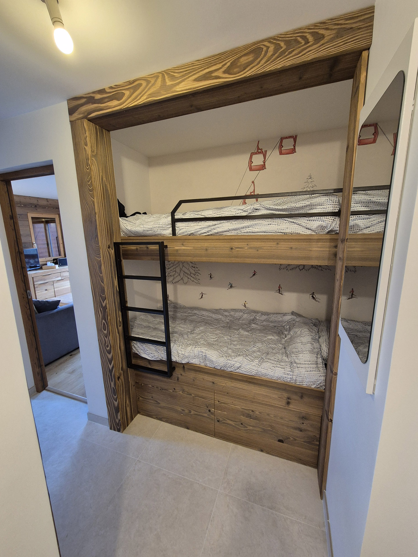Le projet se distingue également par un travail de l’acier sur mesure, avec la réalisation d’une échelle et d’un garde-corps pour les lits enfants, alliant esthétique et fonctionnalité.